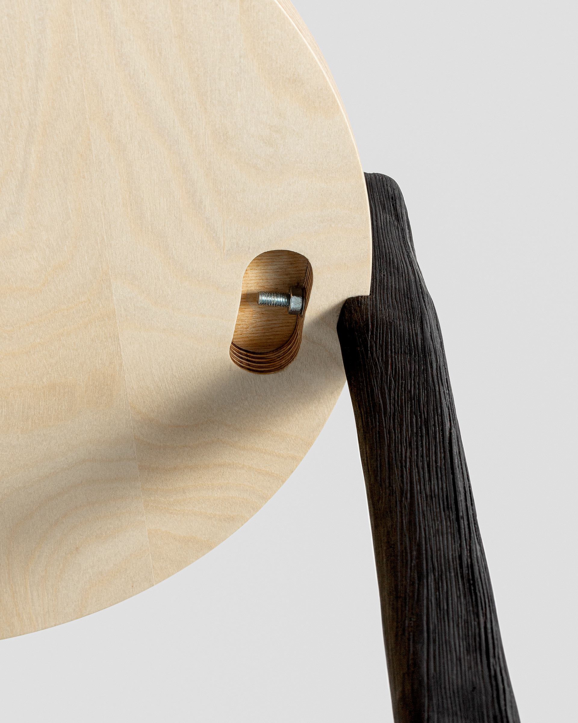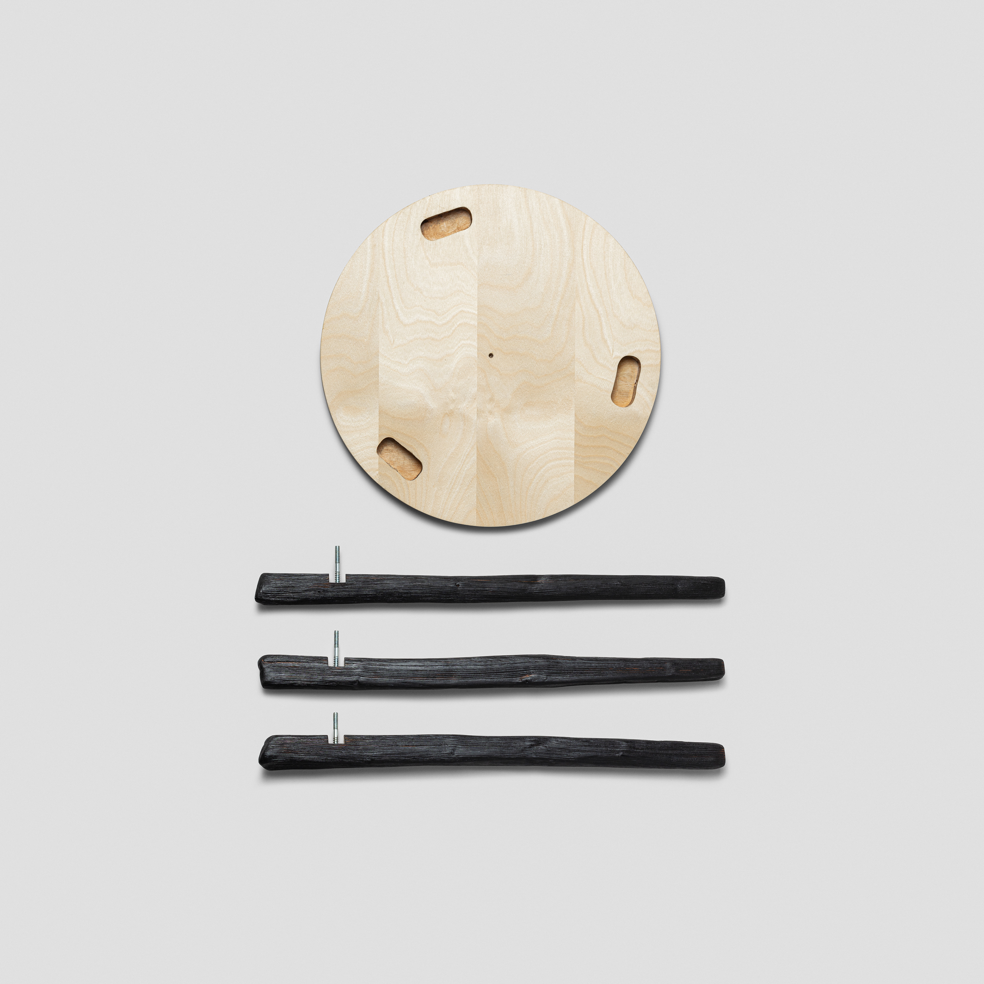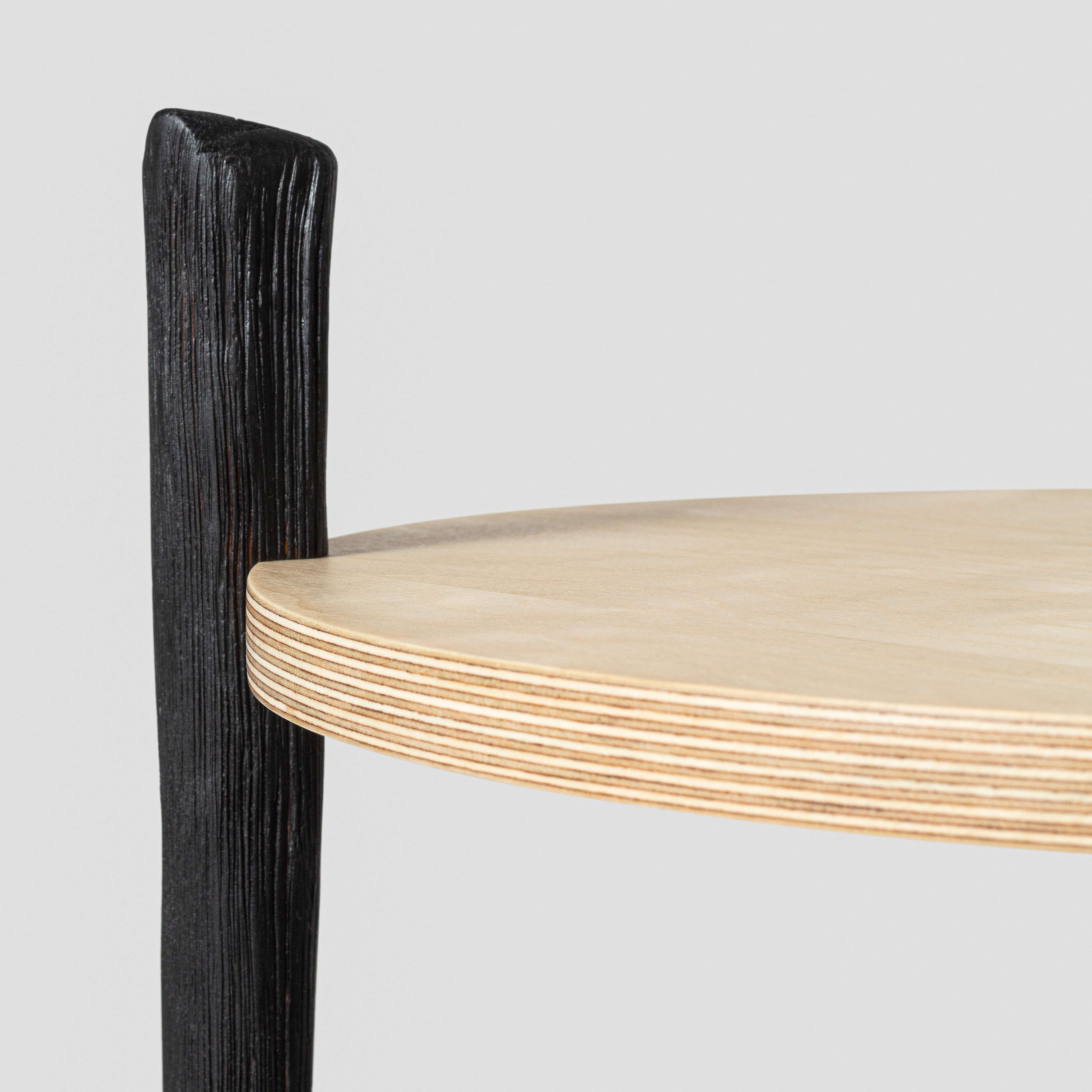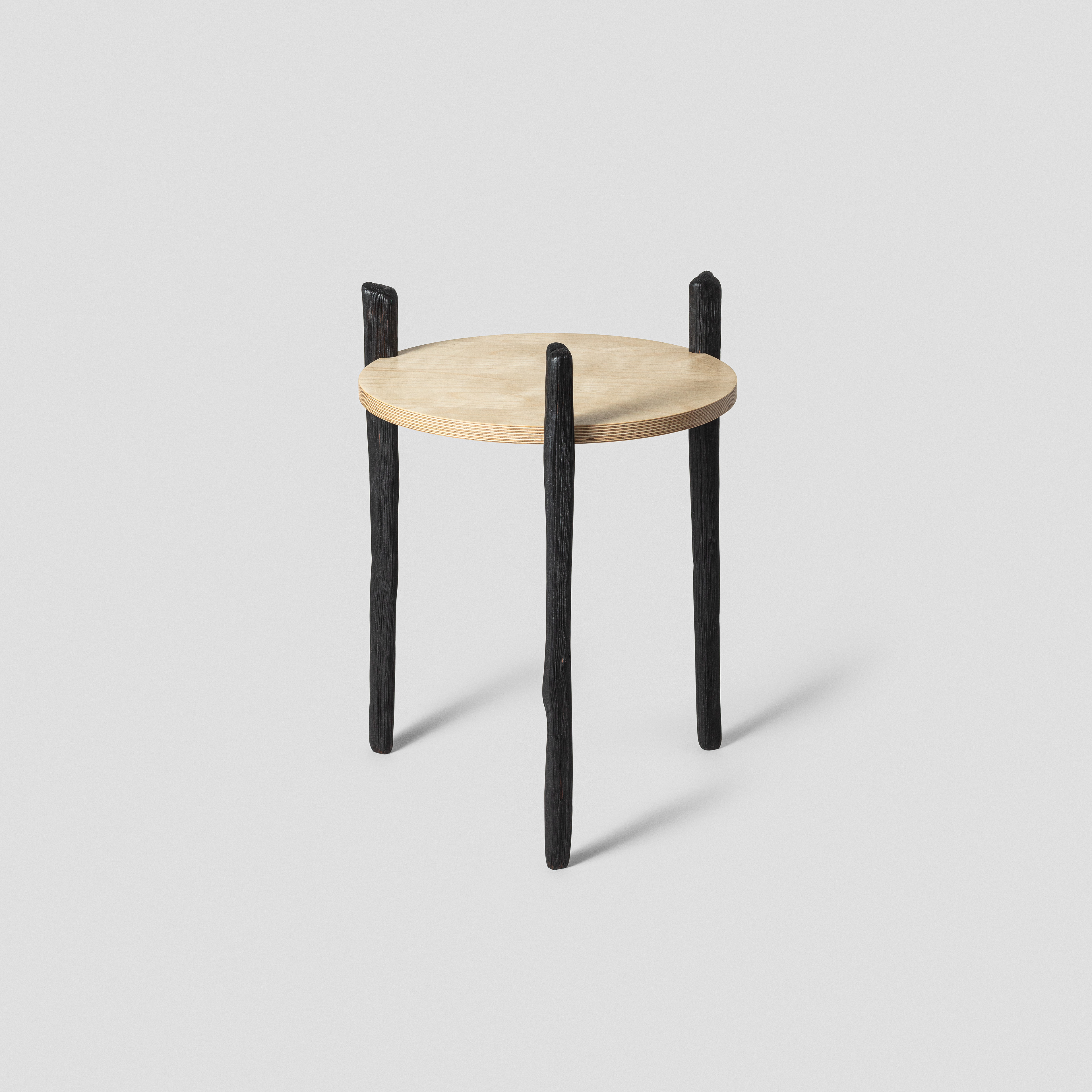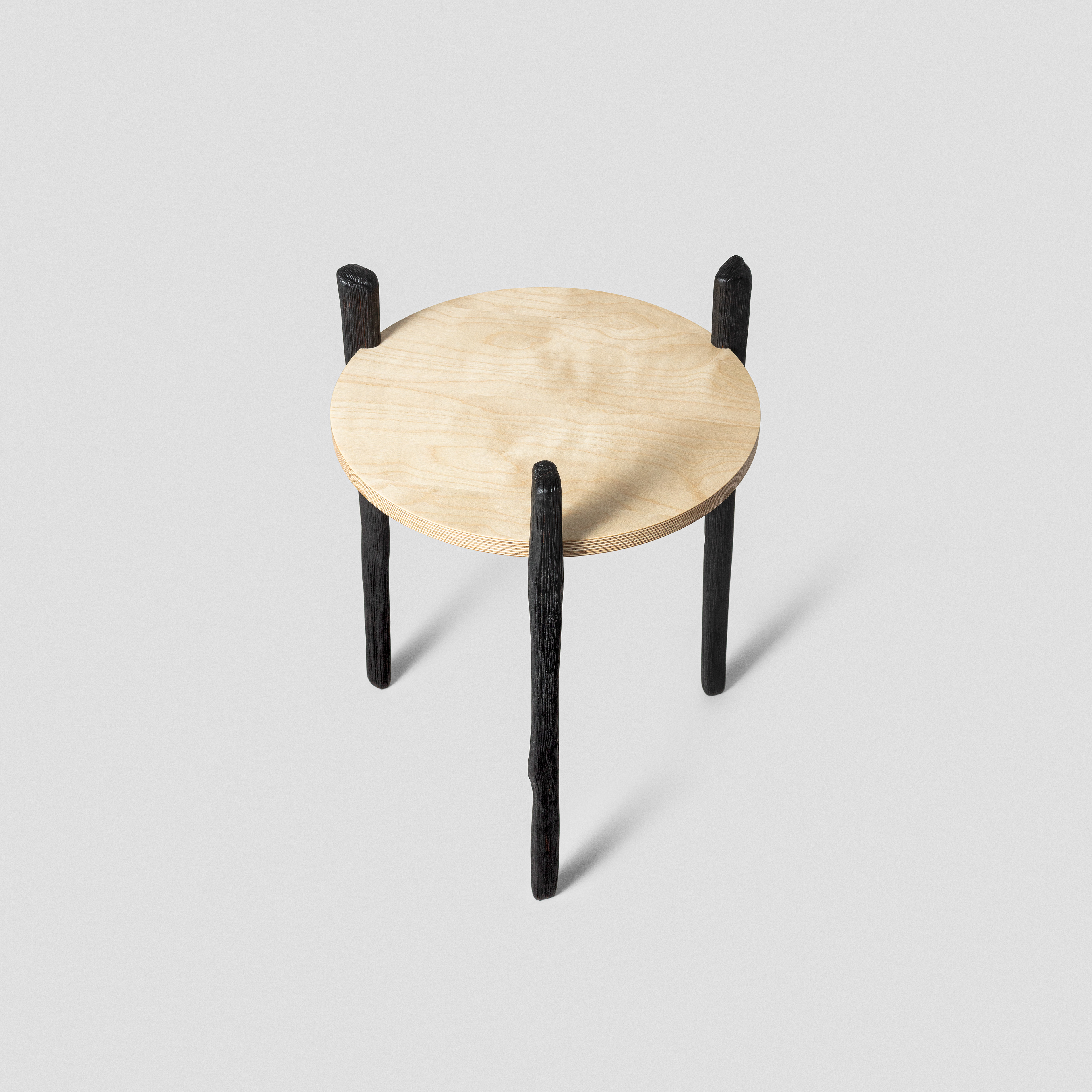 Flat-packable and easily assembled with three nuts. Legs are cleft from ashwood from Trøgstad, carved by hand, brushed and charred. Tabletop from birch veneer plywood. Finished with oil and wax.